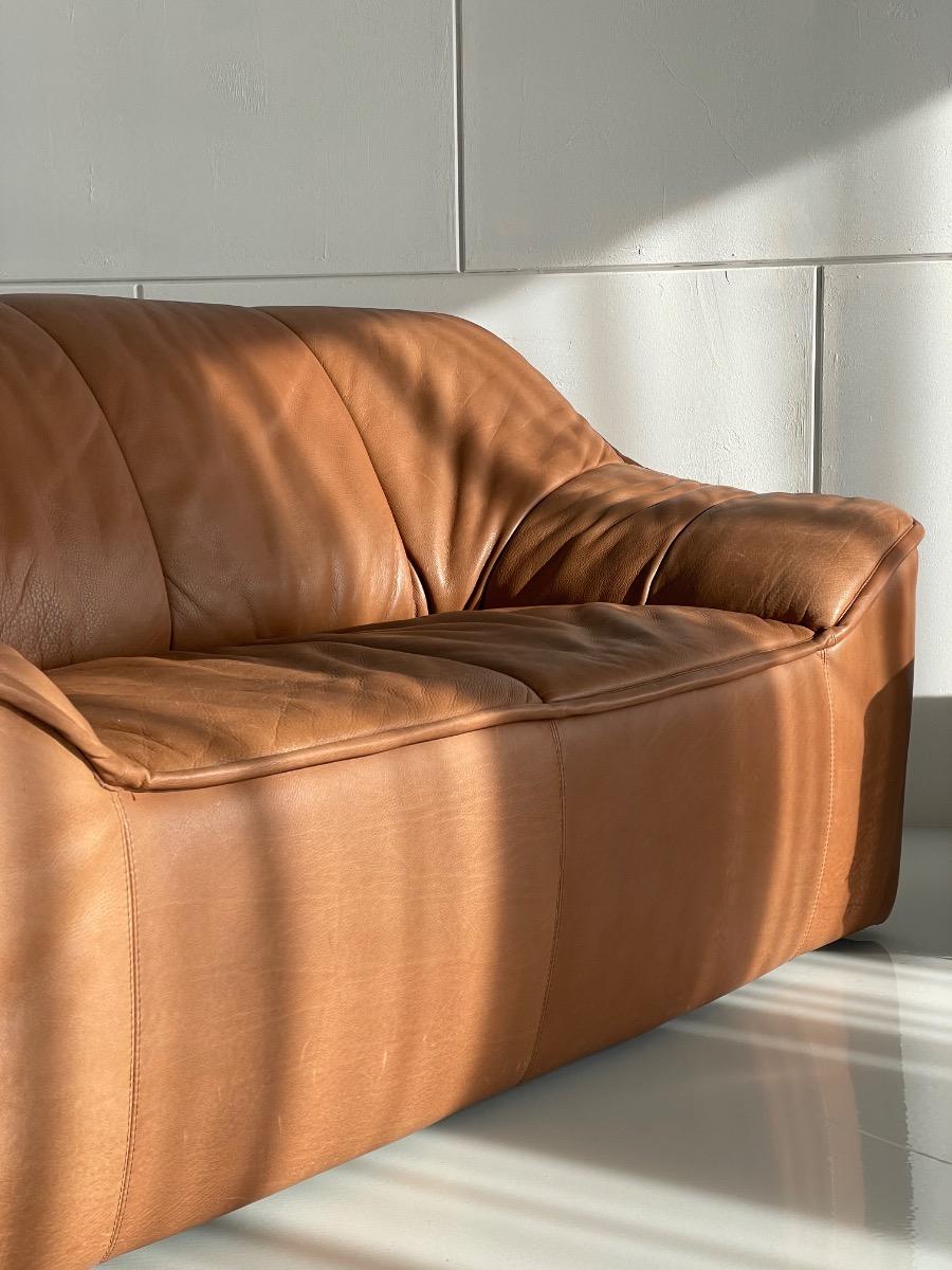 Upholstered in thick buffalo leather in a warm cognac to camel brown tone. The leather has a rich appearance and reflects the high material quality associated with De Sede.